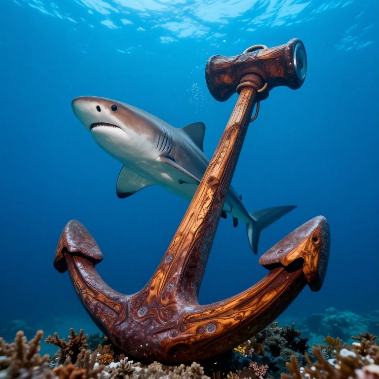 Woody hammerhead shark swimming wrapping around the lower portion giant anchor. hyper realistic vivid color 8k,