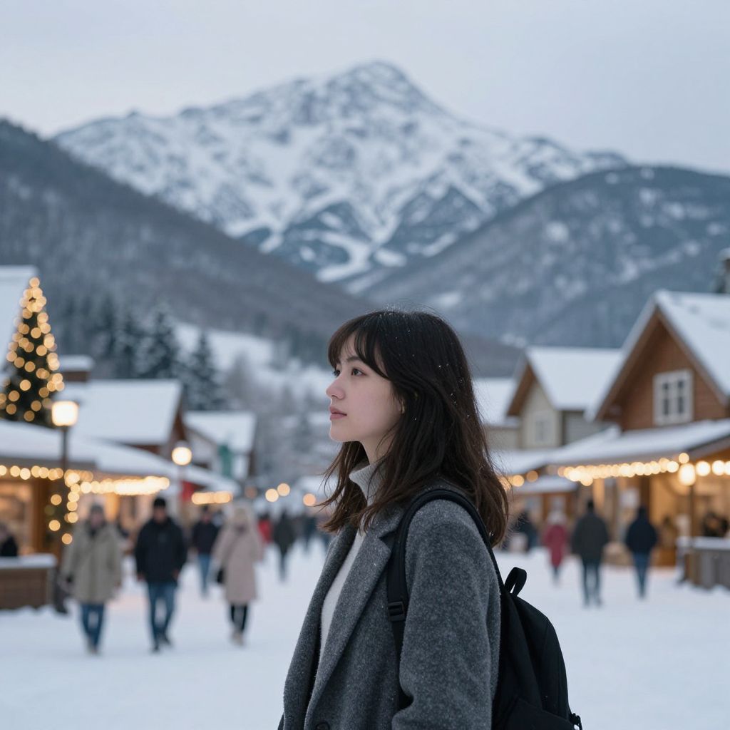 Amidst the crisp embrace of winter, a young woman stands in quiet contemplation, her gaze drifting toward the snowy peaks and festive lights, where the whispers of solitude blend with the warmth of community, evoking a profound sense of belonging and the timeless allure of nature’s grandeur.
