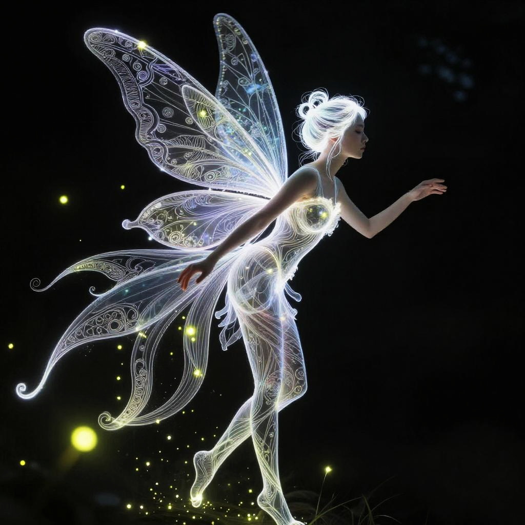 Realistic photo.Enchanting fairy with fluid moves, shimmering wings, cascading hair, magical and whimsical, detailed line art, fireflies dancing around her, intricate silhouette realistic photo