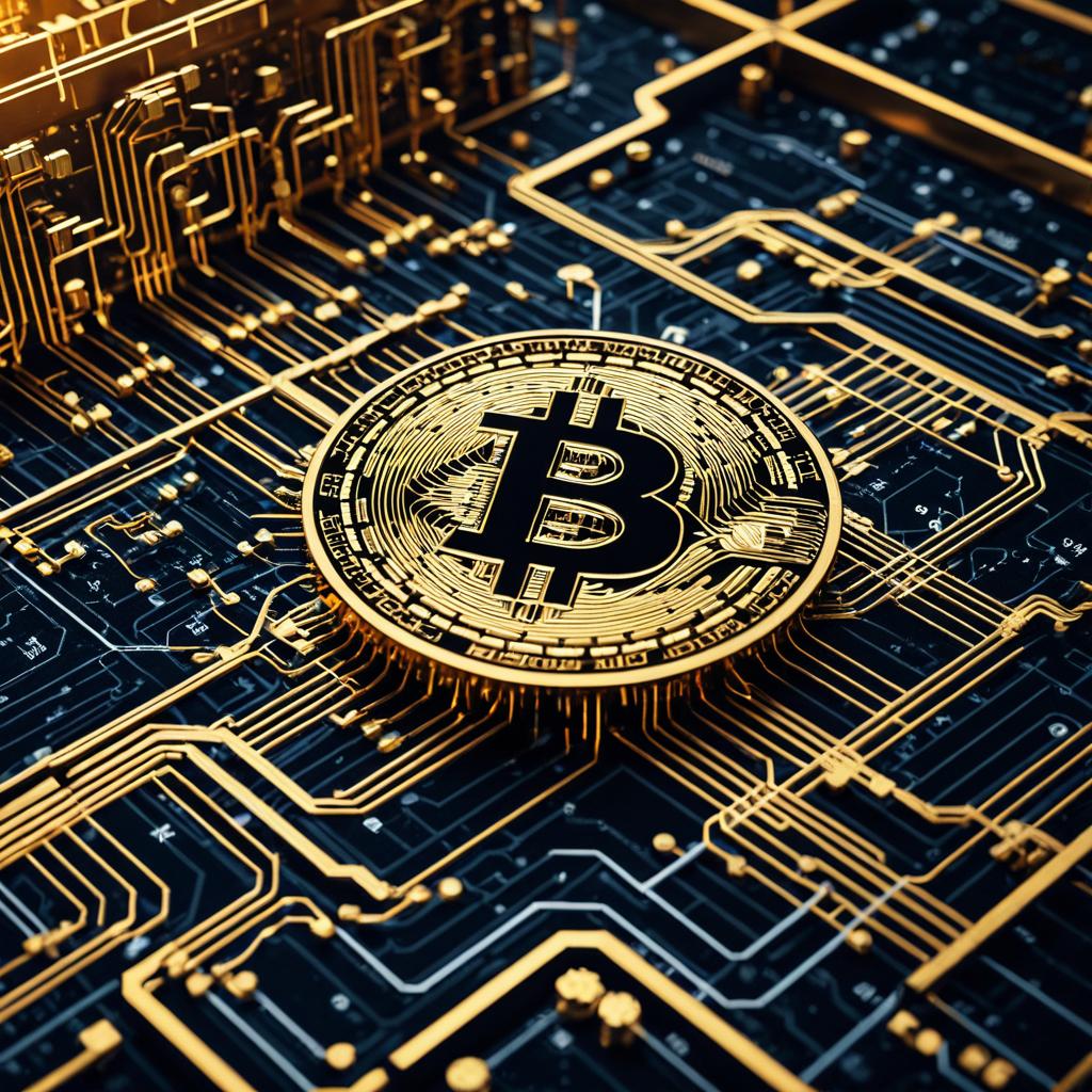 Hyper-realistic digital artwork of the bitcoin logo forged from molten gold, set against a high-tech background featuring a robotic forge, digital wireframe schematics, and pulsating energy cores. The image showcases intricate gold circuitry details on a dark board representing cryptocurrency and blockchain technology.