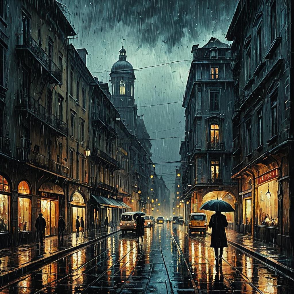 A digital wallpaper, a faded photograph of a rainy cityscape at night, muted colors, dramatic composition, nostalgic, digital painting, rainy, emotionally profound, leaving an indelible and haunting impression on psyche, unforgettable, very intricate, by Hans Zatzka, Leonid Afremov