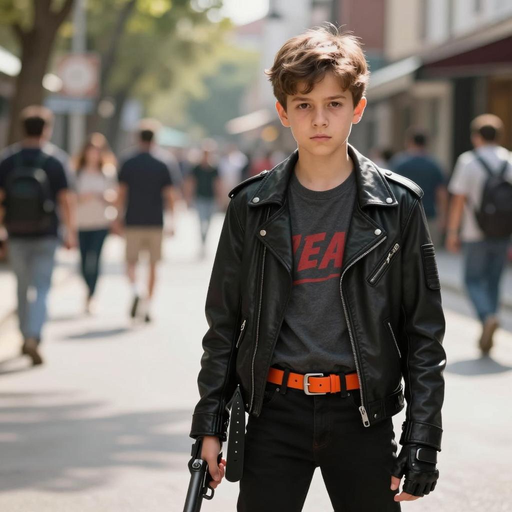 Young boy with light skin and short brown hair wearing a steampunk outfit consisting of a maroon jacket with brass buttons, black neckerchief, brown belt, and a black wide-brimmed hat with goggles on top. He has brown backpack straps and displays a serious expression. The photo is taken outdoors during daylight with a blurred background, showing a realistic movie still in front view.