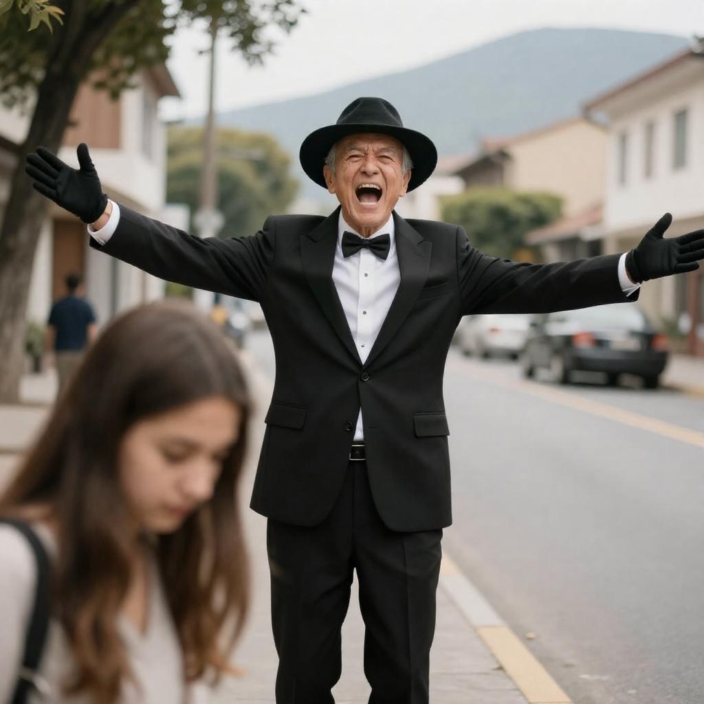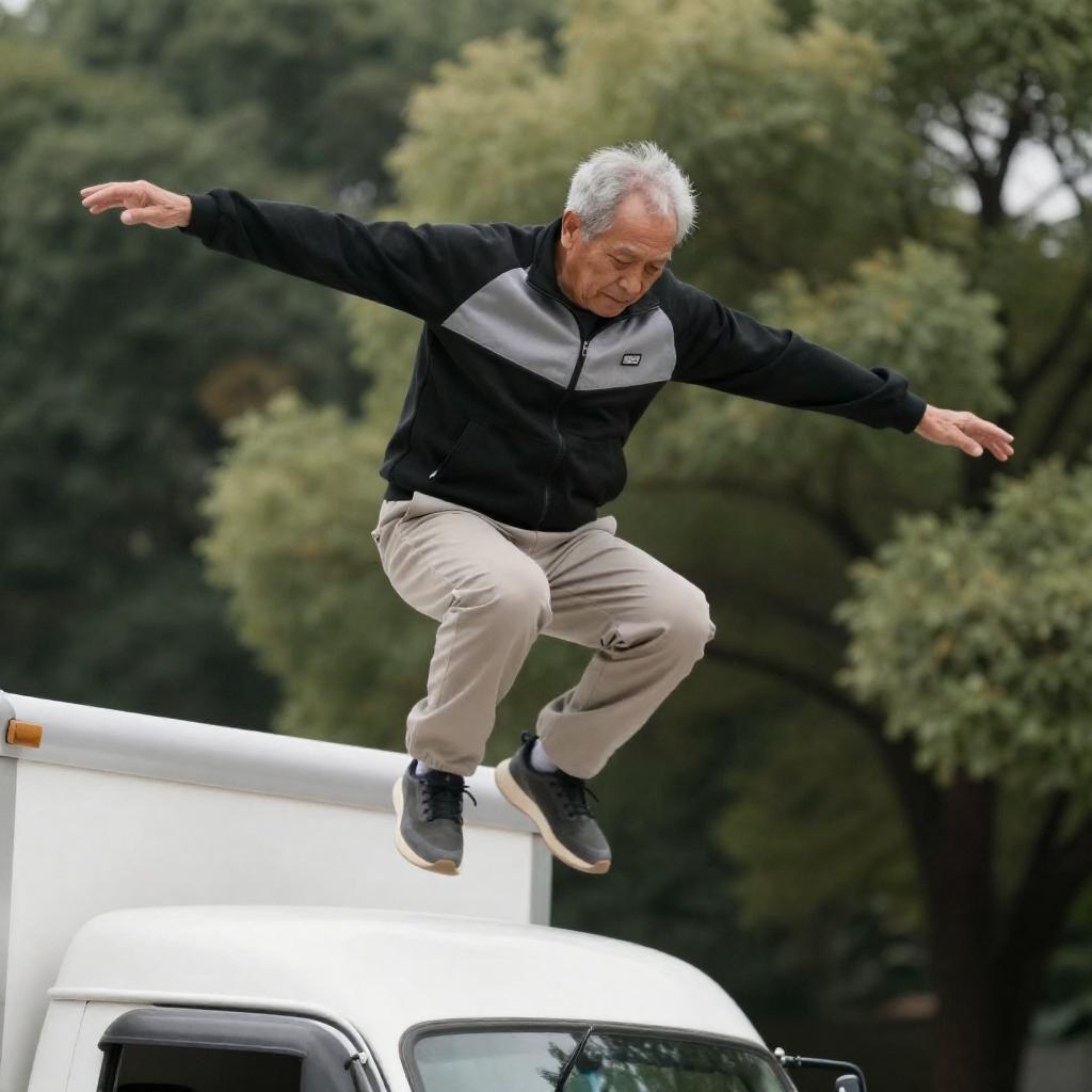 Elderly man with gray hair, wearing a black and gray tracksuit and beige pants, jumps from the roof of a white truck. Green leafy trees in the background. Man's expression is intense, looking downward. His arms are outstretched for balance.