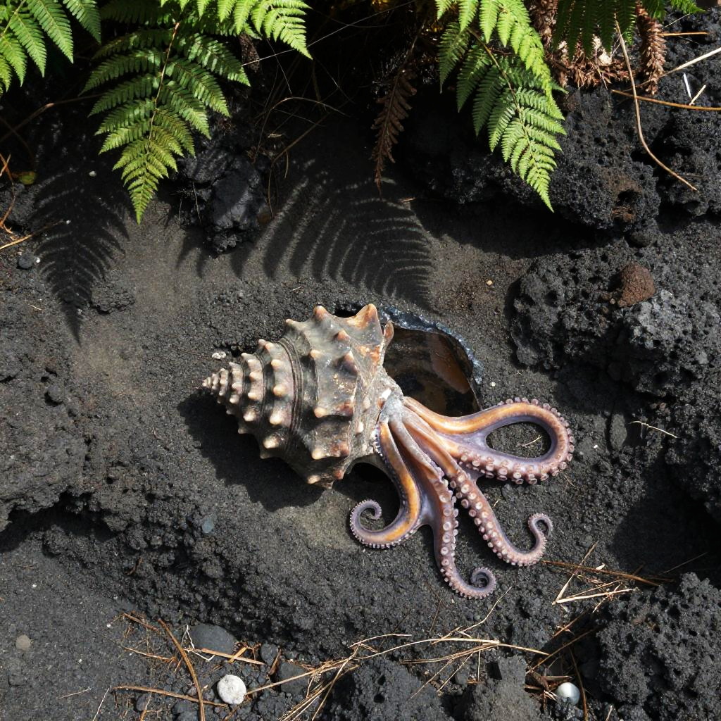 Omastar fossil embedded in a prehistoric beach cliff, surrounded by lush ferns and volcanic rocks, sunlight casting long shadows, realistic texture on the shell and tentacles, atmospheric natural environment, cinematic nature documentary style
