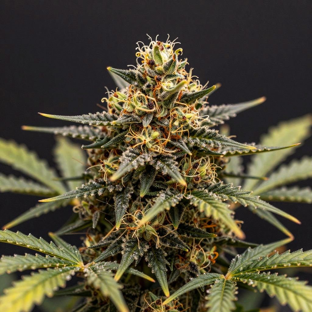 Cannabispflanze at flowering stage with dense, resin-coated buds, set against a dark moody background emphasizing the plant's structure and colors, intricate detail of pistils and crystals, vibrant and lush depiction in high detail.
