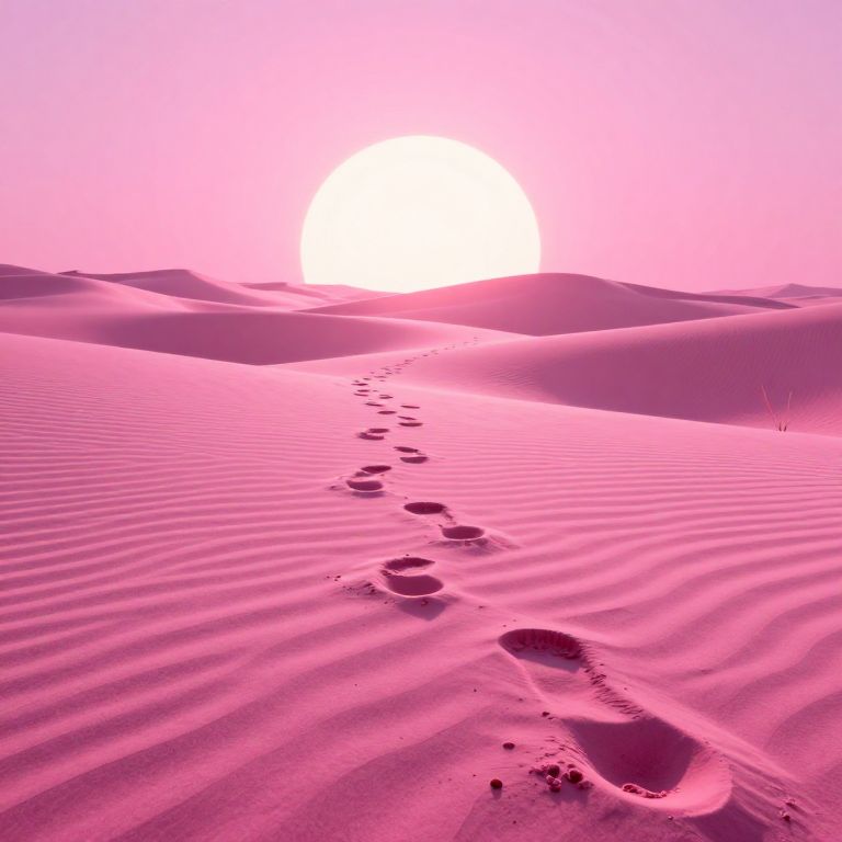 Photograph of a surreal pink desert landscape at sunset. The sun, a bright white orb, hovers behind gently rolling sand dunes. The sand is textured with rippling patterns, highlighted in vivid pink hues. A single trail of footprints, starting in the foreground and leading toward the horizon, adds a sense of depth and movement. The sky transitions from bright pink at the top to a softer pink near the horizon. The overall effect is otherworldly and dreamlike, with a strong emphasis on color and texture.