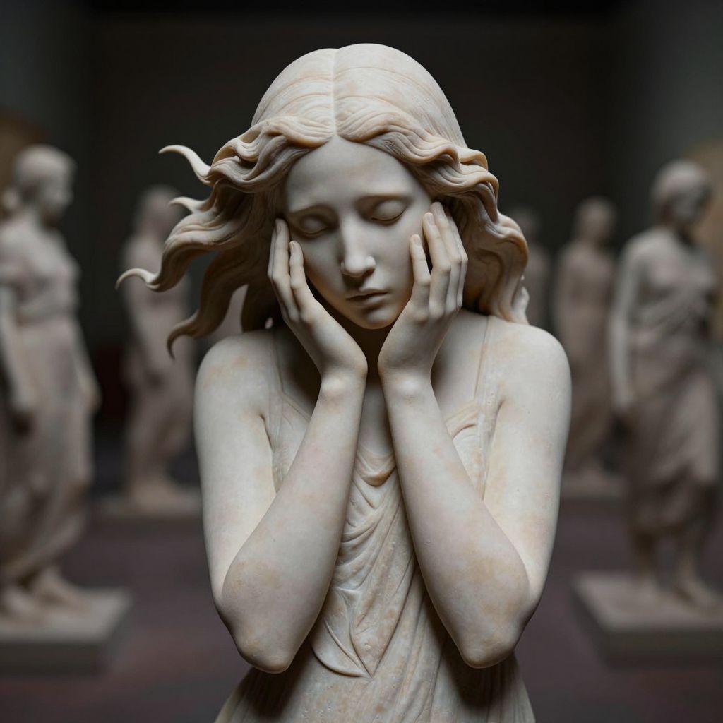 Photorealistic digital art of a sorrowful marble statue with wavy hair, hands on cheeks, surrounded by blurred classical sculptures in a dimly lit