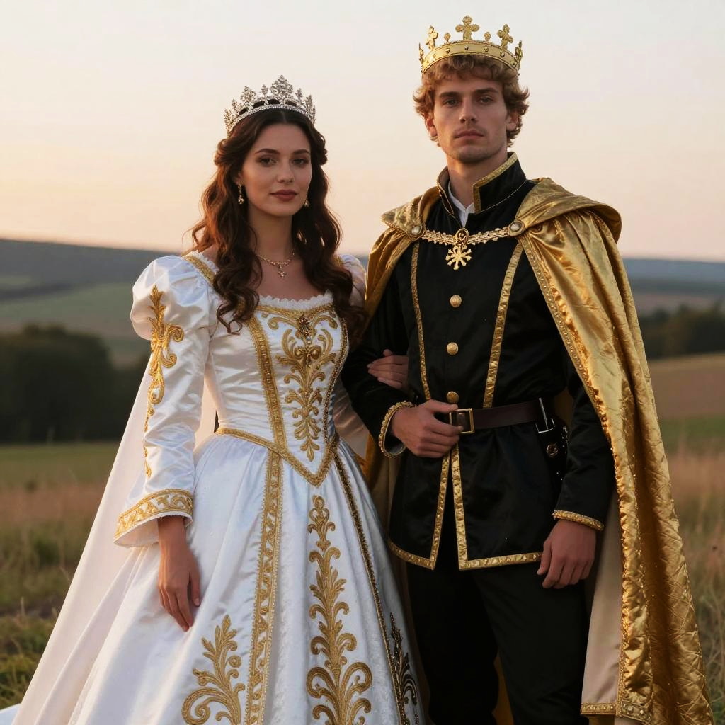 A man and woman dressed in elaborate king and queen costumes pose outdoors in a natural setting at sunset. The woman wears a white gown adorned with gold embroidery and a tiara, while the man is clad in a regal black uniform with a golden cape and crown, evoking a royal medieval style.