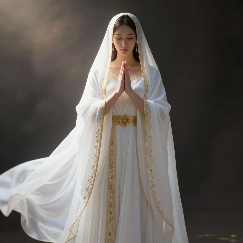 Photograph of a serene Asian woman in a white, gold-embroidered robe and veil, standing with hands in prayer, illuminated by soft light