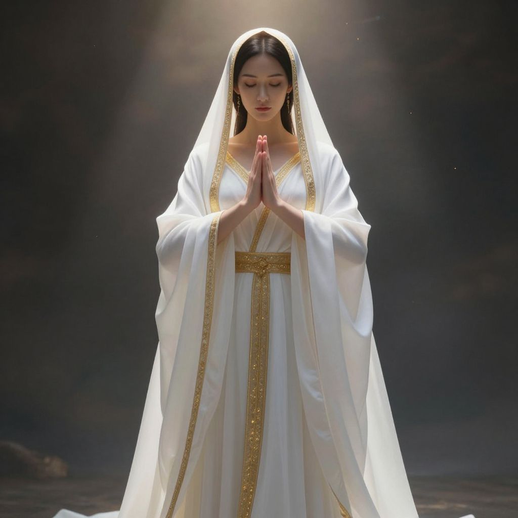 Woman draped in a flowing white robe and golden accents stands in prayer, her hands pressed together in a gesture of devotion against a dark, ethereal backdrop illuminated by soft, divine light.