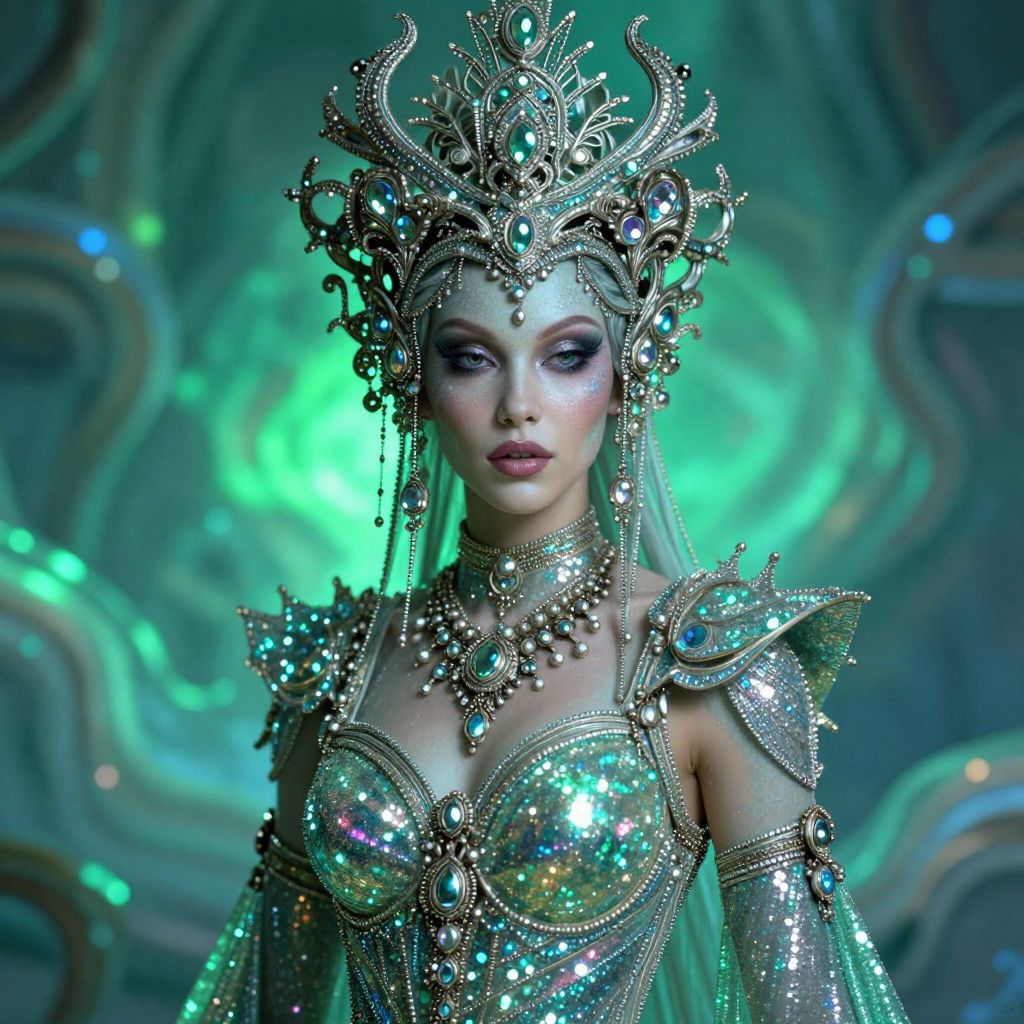 The image depicts a striking, otherworldly figure reminiscent of an antlantean princess, rendered in a highly detailed, advanced, and glittering style. The figure is adorned with an elaborate, baroque headpiece that features intricate designs and shimmering elements, evoking a sense of opulence and otherworldliness. The headpiece is complemented by a similarly detailed, shimmering outfit that drapes elegantly, adding to the regal and fantastical appearance. The background is a blend of green and aqua hues, creating a trippy, surreal atmosphere that enhances the dreamlike quality of the scene. The overall composition is rich in texture and depth, with elements that appear both lifelike and fantastical, suggesting a blend of reality and the surreal. The figure's pose and the arrangement of the elements within the image create a sense of depth and perspective, drawing the viewer's eye into the scene. The use of light and shadow adds to the dramatic effect, highlighting the intricate details of the figure's attire and accessories. The image is a stunning example of digital manipulation, showcasing the artist's skill in creating a visually captivating and mythological scene.
