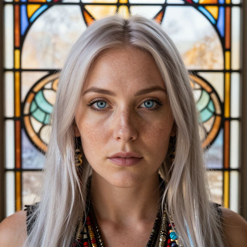 Photograph of a fair-skinned woman with long, straight silver hair and blue eyes, standing in front of a colorful, stained-glass window with geometric patterns. She has subtle freckles across her nose and upper cheeks, and wears dark, beaded earrings and a black, beaded necklace. Her expression is neutral, with slightly parted lips. The background shows a mix of yellow, blue, and orange glass, adding a warm, artistic contrast to her cool-toned appearance. The image is sharply focused on her face, highlighting her natural beauty and the intricate details of the stained glass behind her.
