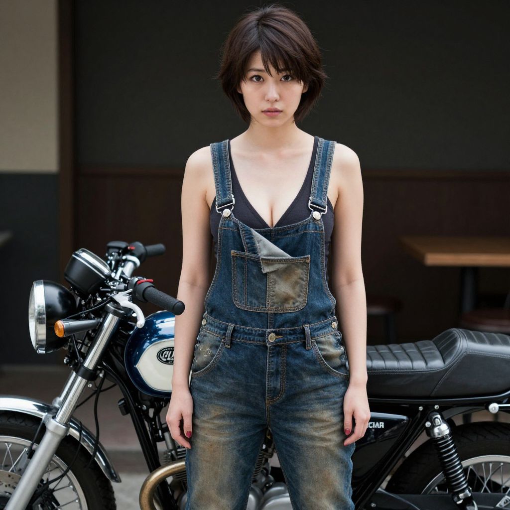 A stunning Japanese woman with short hair stands in front of a classic cafe racer motorcycle, wearing a dirty overall with a deep v-neck, her eyes looking into the camera with a dramatic expression.