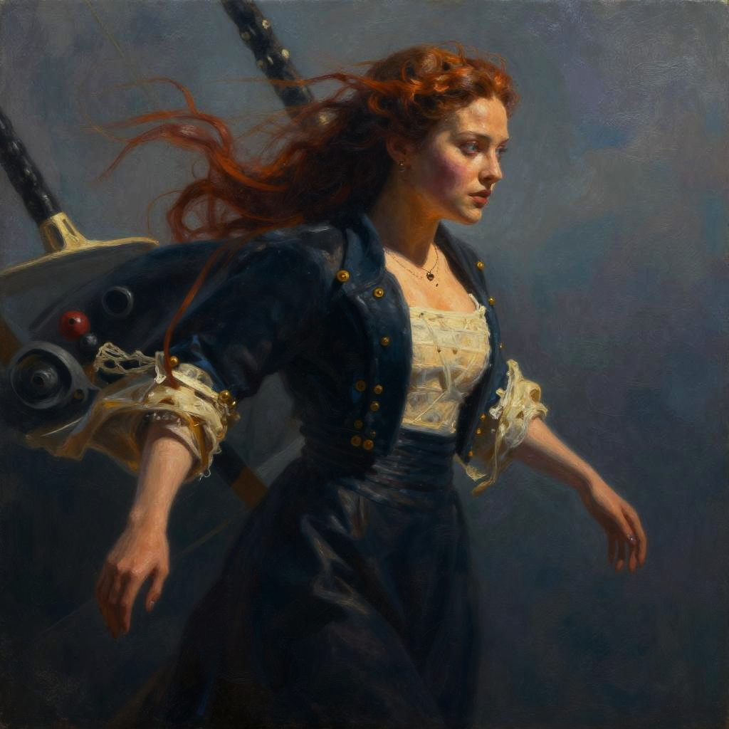 War-torn painting of a naval battle. Large battleship with explosions and smoke in the background. Small plane with "W" on side flying overhead. Foreground shows a shocked man with short brown hair and a woman with black hair. Turbulent sea with white waves. Man and woman have intense expressions.