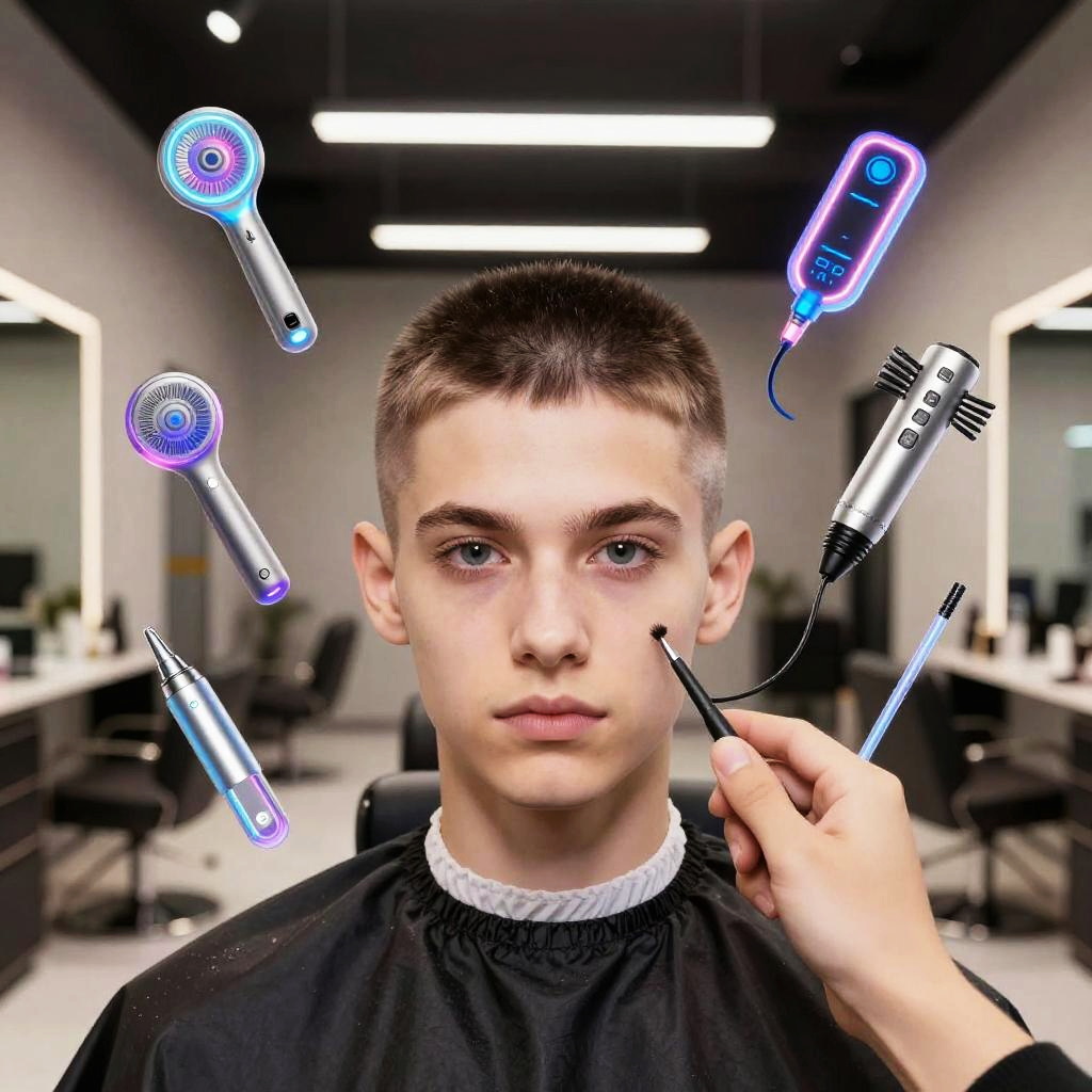 Is there a buzz cut filter demonstrated in a virtual salon environment, neon holographic tools floating, high-definition textures, modern interior lighting, user interacting with the interface, sharp focus on face and haircut, sci-fi theme.