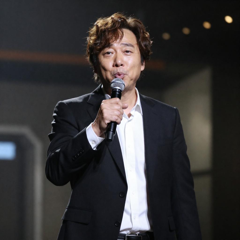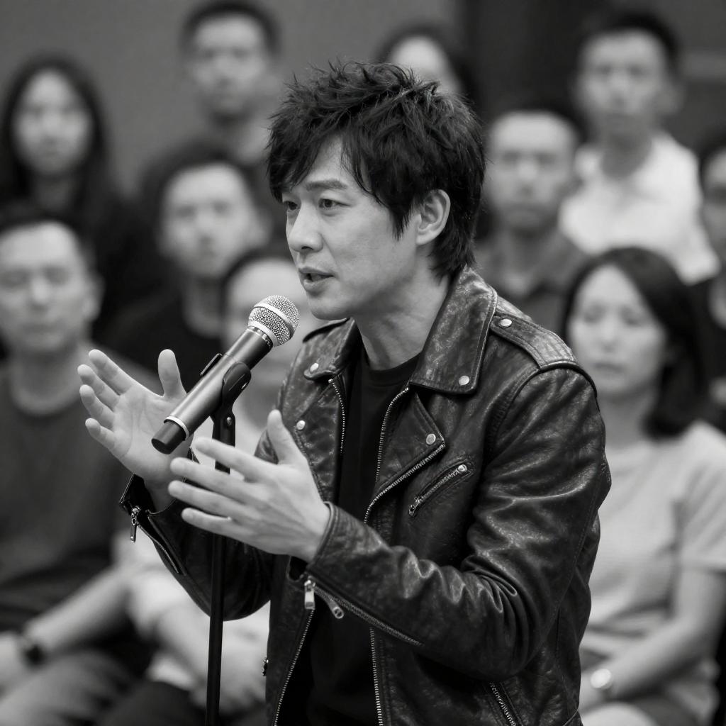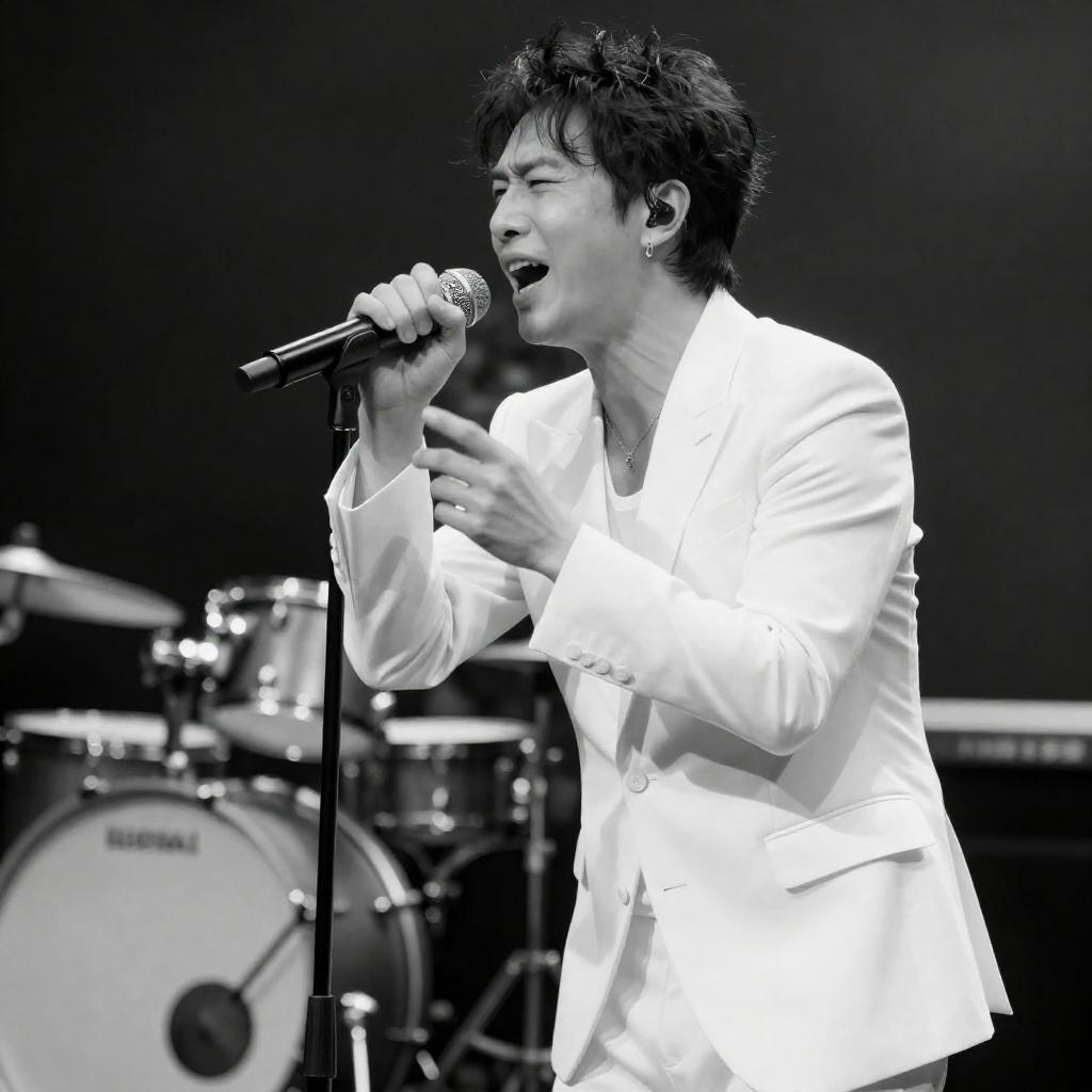 Black-and-white photograph of an Asian male singer with short, dark hair, wearing a leather jacket, standing at a microphone, gesturing with both hands. A blurred crowd of seated people fills the background, creating a sense of depth and focus on the singer. The singer's expression is intense and engaged.