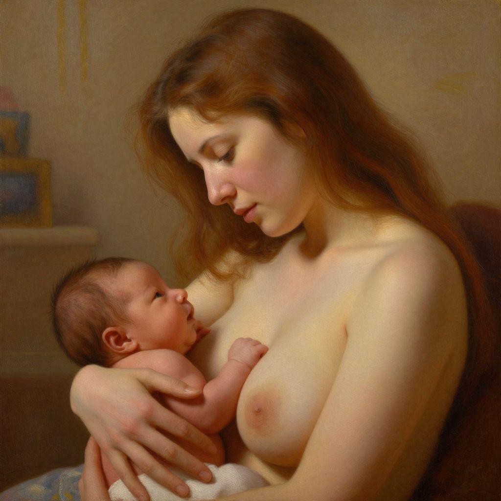 A digitally rendered, hyper-realistic photograph of a topless, fair-skinned woman with long brown hair, cradling a newborn baby. The woman gazes lovingly at the baby, who looks up at her with wide eyes. The woman’s medium-sized, natural breasts are visible, and her right hand gently supports the baby’s head while her left hand cradles the baby’s back. The baby has short, dark hair and is wrapped in a white cloth. The background is softly blurred, featuring warm, neutral colors and a shelf with indistinct objects. The image emphasizes tenderness and intimacy.