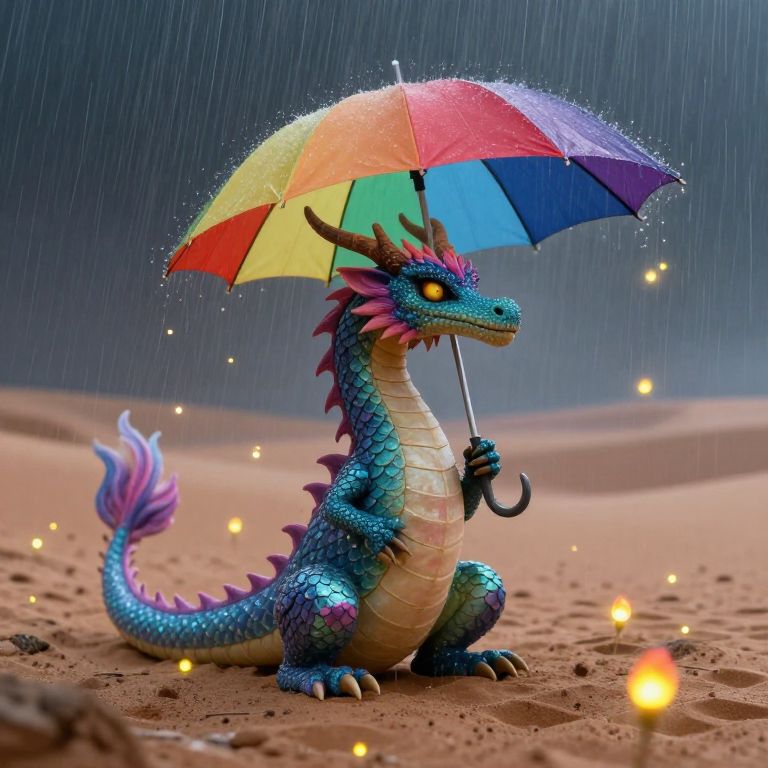 A whimsical dragon, adorned with vibrant scales and a rainbow umbrella, sits serenely amidst a surreal desert rainstorm, surrounded by delicate fireflies that dance around its ethereal form.