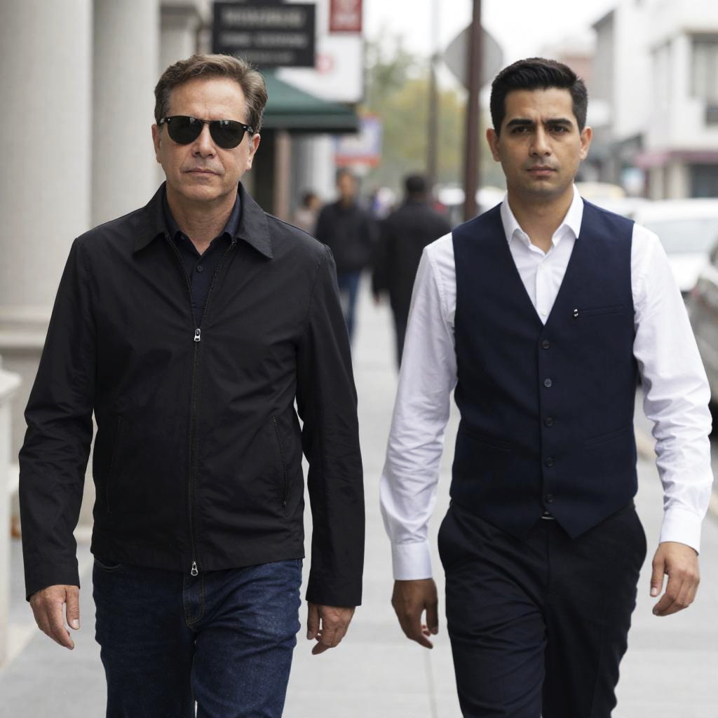 Photograph of two men on a city street. Bald man in dark blue shirt, sunglasses, dog tags, and blue jeans stands facing another man in white t-shirt and black pants leaning against a building. Background includes blurred pedestrians and street elements. Bald man's expression is focused, other man's expression is neutral. Both men hold objects in their hands.
