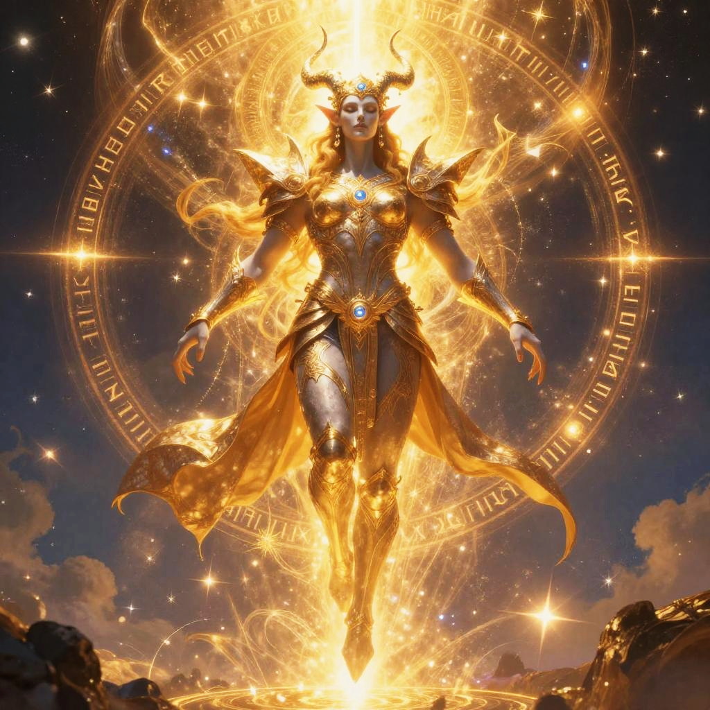 Nephilim descending from the heavens through a burst of golden light, enormous and majestic, with intricate celestial armor, surrounded by floating runes and stars, mystical and divine aura, fantasy art with vivid colors and dynamic motion
