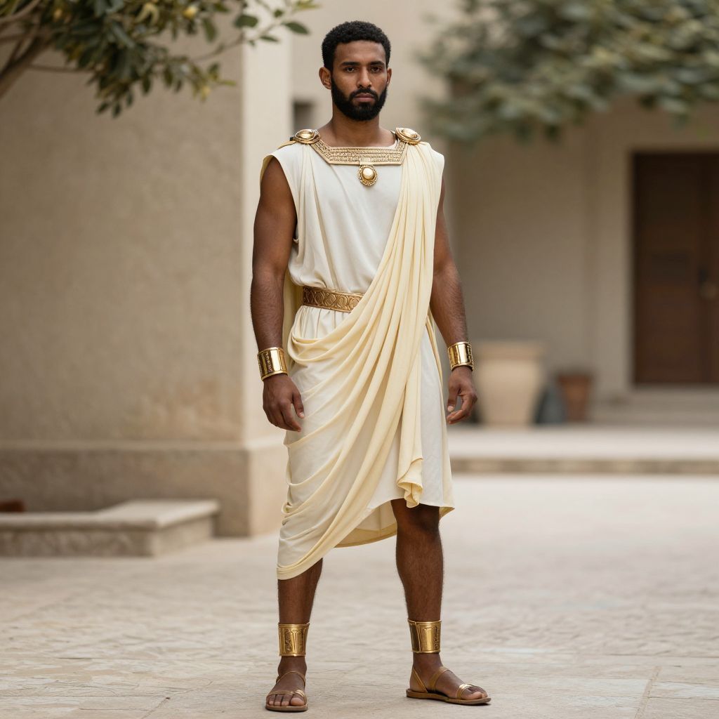Greek goddess costume man, 1boy, male focus, solo, facial hair, beard, greco-roman clothes, ancient greek clothes, jewelry, full body, dark skin, dark-skinned male, sandals, standing, short hair, bracelet, outdoors, toga