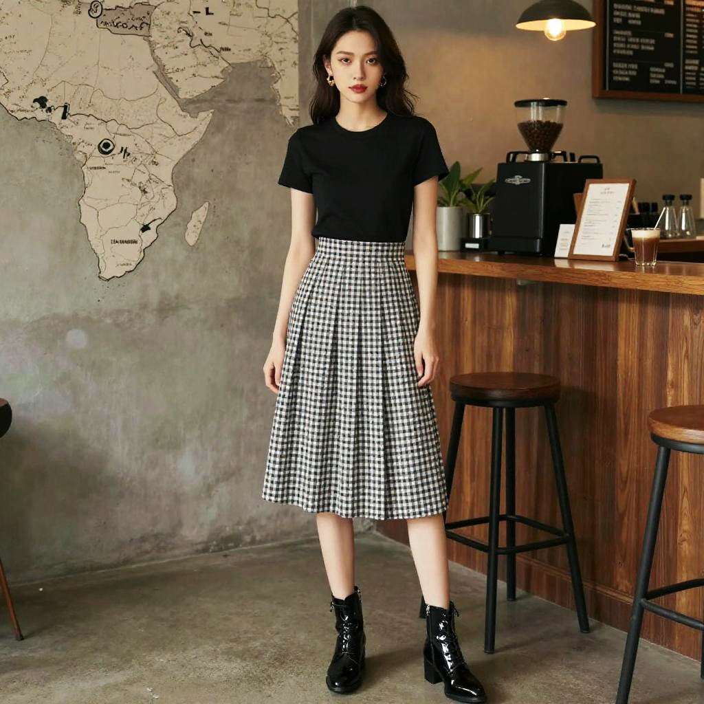 A slim woman in a casual chic outfit featuring a black and white striped long-sleeve top with a knotted waist, skinny black jeans, and brown ankle boots, stands under string lights in a charming bistro, captured in a vertical inc visual style. Sexy. Pretty face and beutiful eyes