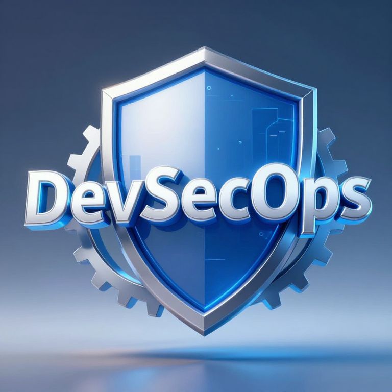 Digital logo featuring a blue, glowing shield with gears and the bold, 3D text "DevSecOps" in white.