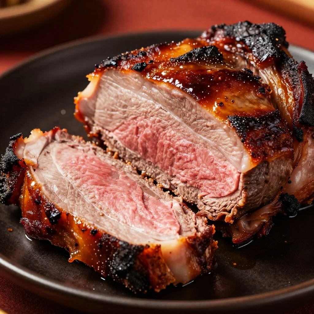 Close-up photo of juicy, sliced roast meat with a crispy, caramelized crust, stacked on a dark, glossy plate. The meat has a tender, pinkish center with browned edges, and a slightly grainy texture. The background is a warm, out-of-focus red, enhancing the rich, savory colors of the roast. The image has a slightly high-contrast, vibrant style.