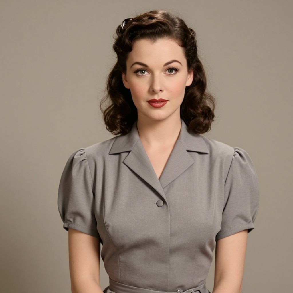 Elegant vintage portrait featuring a woman in a 1940s-style dress with puff sleeves and a collared neckline, set against a neutral backdrop, showcasing classic pin-up aesthetics reminiscent of Del Masters' work.
