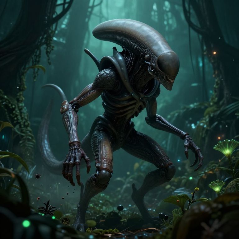 Abathur concept art, alien insectoid mutation specialist with bio-mechanical appendages, spreading spores in a dark alien jungle, bioluminescent flora, highly detailed textures, atmospheric moody lighting, sci-fi fantasy style