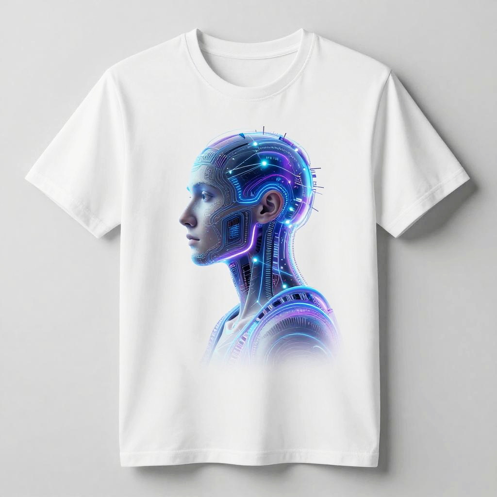 T shirt AI design concept, futuristic artificial intelligence graphic on a minimalistic white tee, sleek neural network patterns glowing softly, vibrant tech-inspired color palette with blue and purple hues, modern urban fashion style
