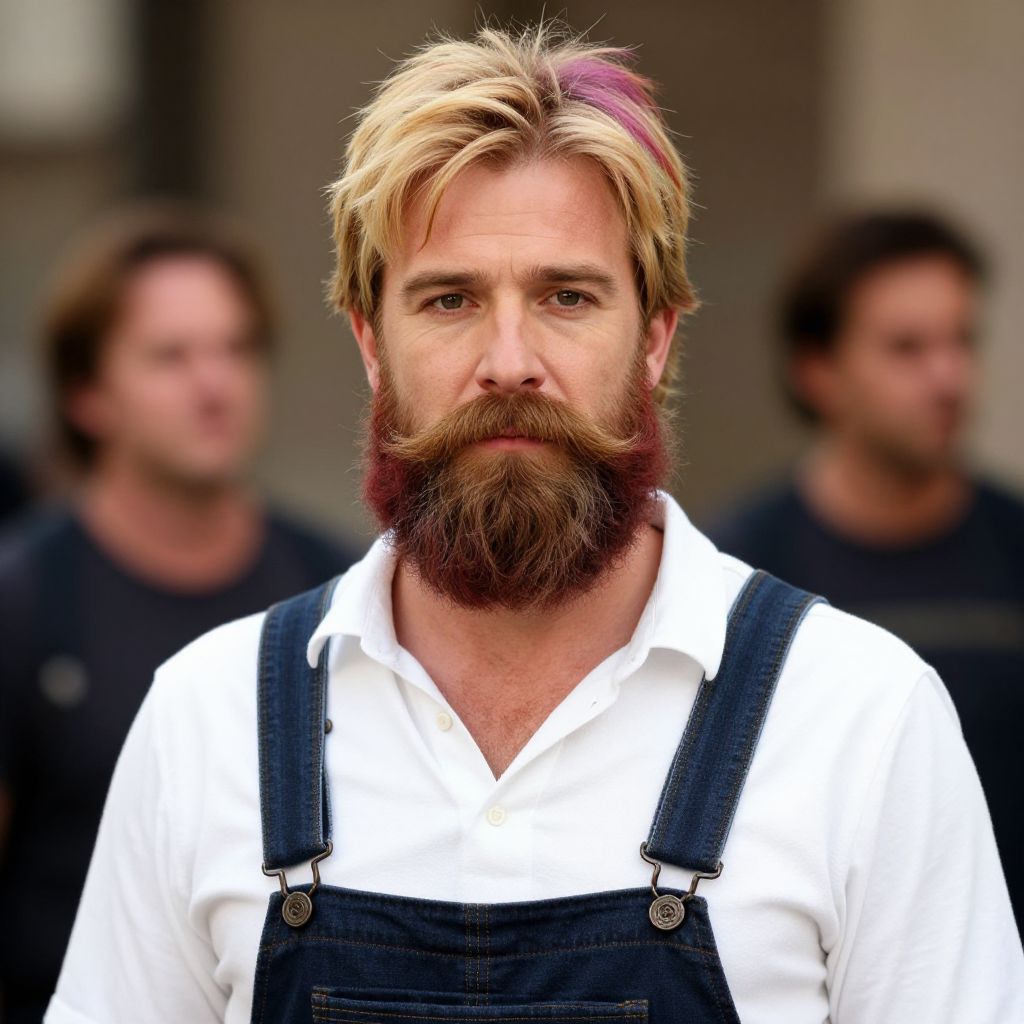 Guy fieri goatee costume, 1boy, male focus, facial hair, solo, beard, overalls, shirt, realistic, white shirt, looking at viewer, blonde hair, mustache, blurry, upper body, blurry background, short hair, multicolored hair, brown hair, closed mouth