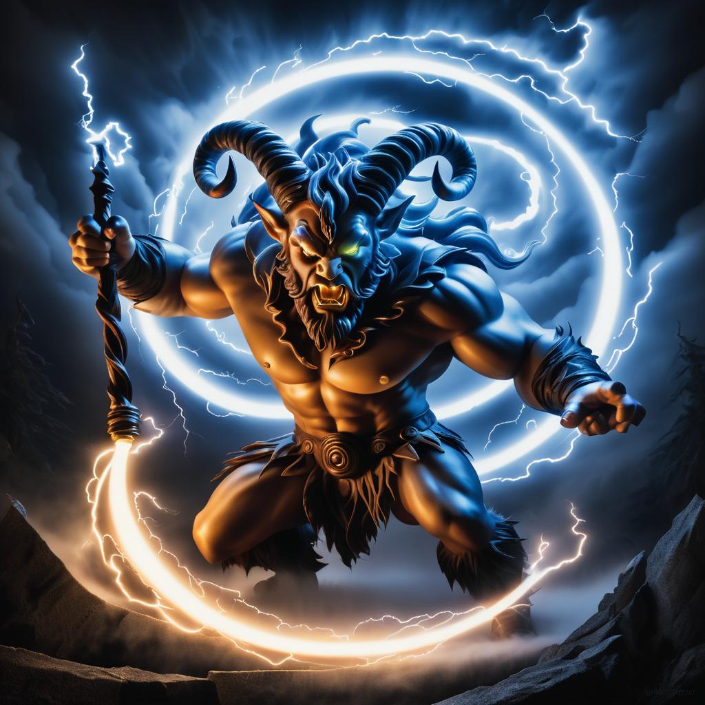 Airbrush drawing of a swirling storm, featuring a hybrid Cyclops-Satyr with electric horns, hyper-realistic with torchlight.