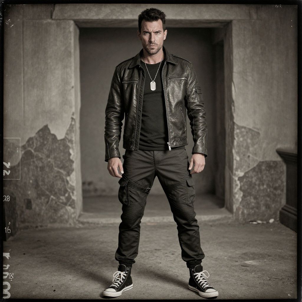 A man, biker-style leather jacket, tapered tactical joggers, high-top sneakers, silver dog tag necklace, crumbling fortifications, daguerreotype film, intense expression, moody atmosphere. Man has masculine face and piercing eyes