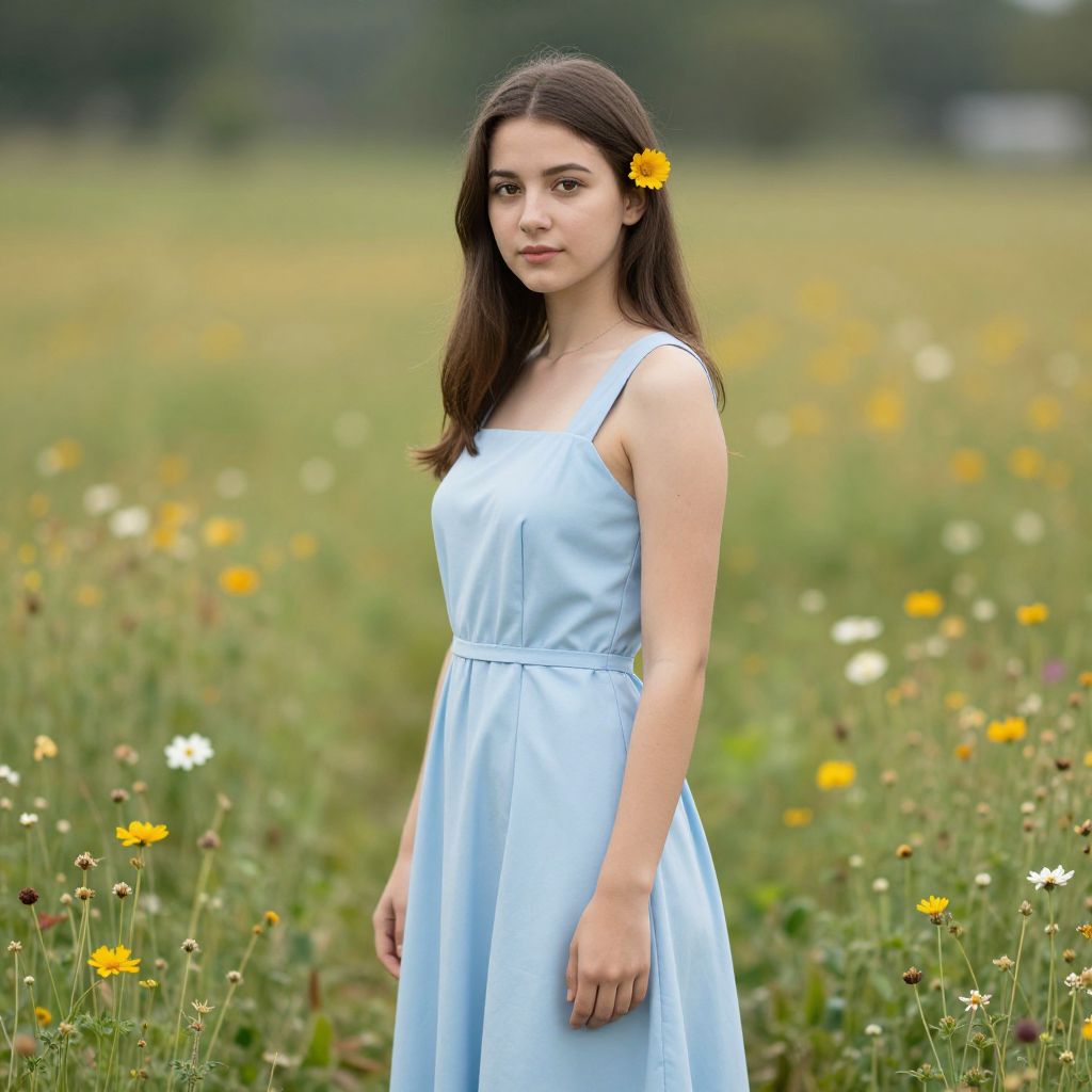 Photograph of a young girl with fair skin and dark brown hair, wearing a light blue sundress, standing in a vibrant meadow with yellow and