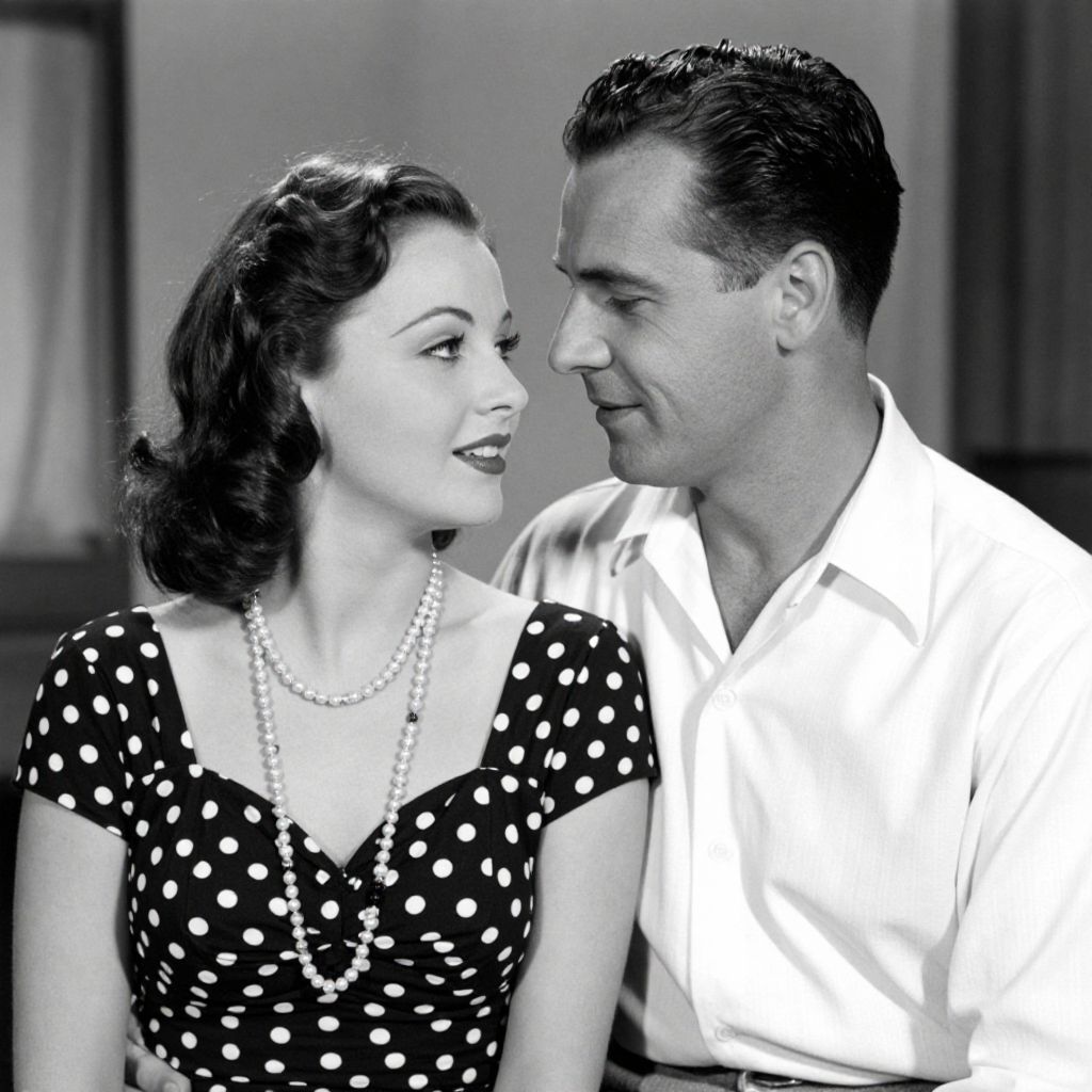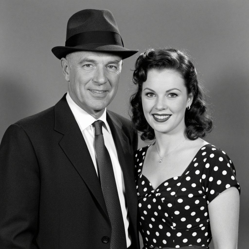 Classic black-and-white portrait of two individuals dressed in vintage attire, featuring a man wearing a fedora and suit jacket alongside a woman in a polka-dotted dress, both smiling warmly while standing close together against a neutral background.