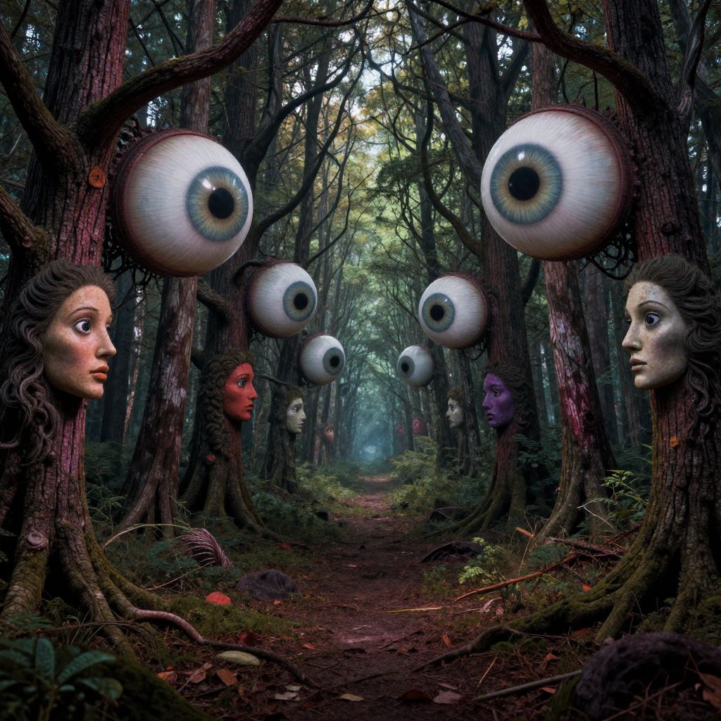 Digital art of a forest with giant eyes and faces on trees, featuring diverse facial expressions, and a misty, narrow path. Surreal, eerie