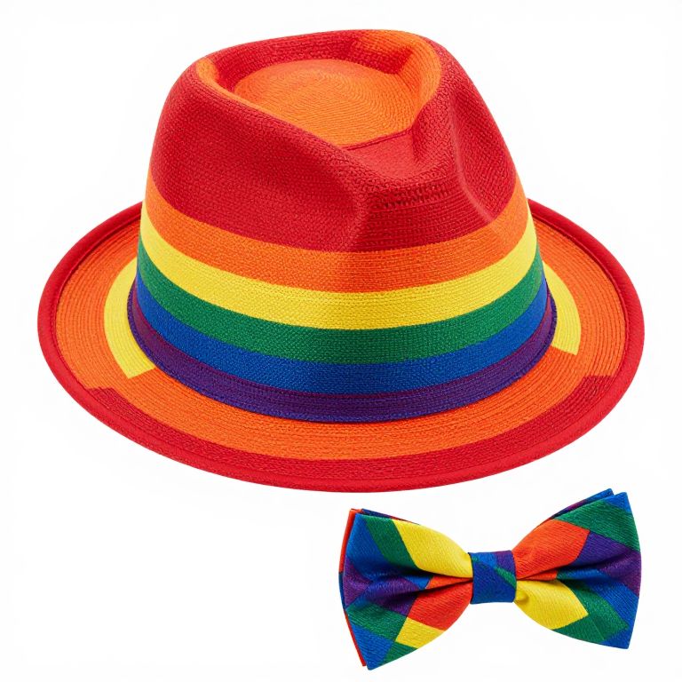 Vibrant rainbow-fedora hat and bowtie combo set featuring a short-brimmed trilby design with bold stripes in red, orange, yellow, green, blue, and purple, complemented by a matching bowtie with a geometric pattern.