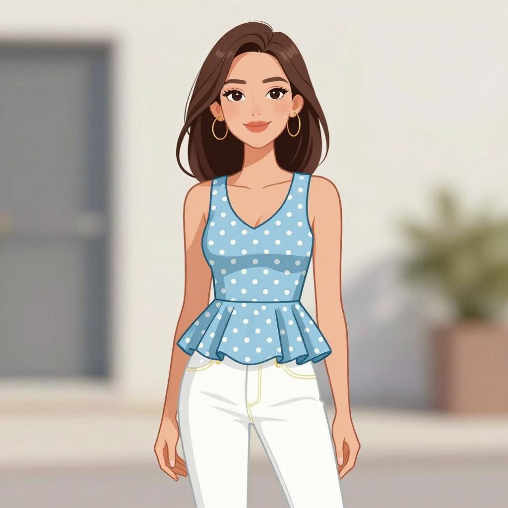 Digital illustration of a young woman with medium-length brown hair, fair skin, and dark eyes. She wears a light blue sleeveless top with white polka dots, a flared ruffled waist, and white pants. Her outfit is complemented by large silver hoop earrings. The background is blurred, featuring a gray door on the left and a potted plant on the right, suggesting an outdoor setting. The woman stands in the center, facing forward with a slight smile. The style is clean and modern, with vibrant colors and smooth lines.