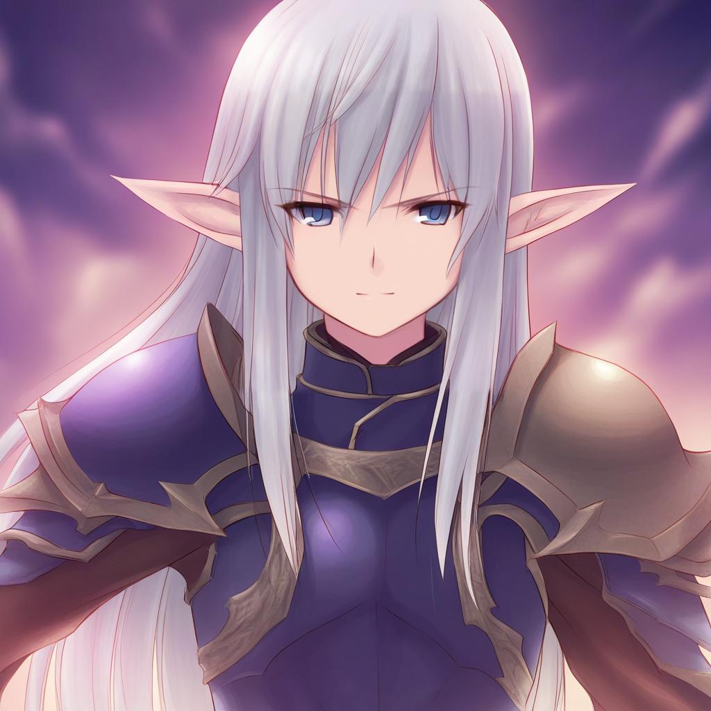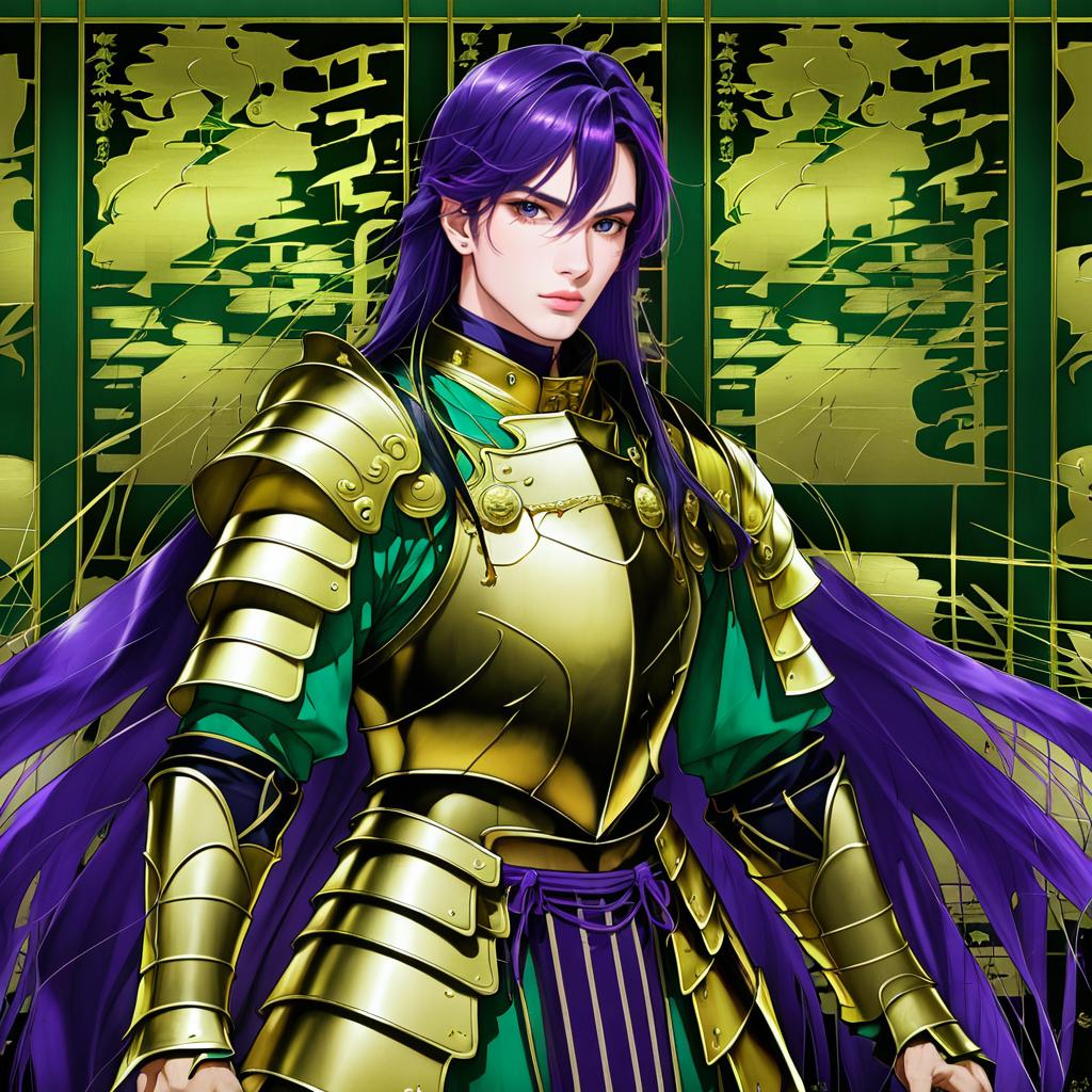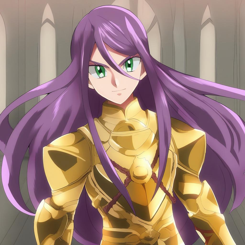 Anime-style illustration of a confident male character with long purple hair and striking green eyes. He is dressed in detailed gold armor standing in front of a gothic cathedral-like background with tall arched windows. The character exudes strength and nobility, wearing elaborate armor with intricate design.
