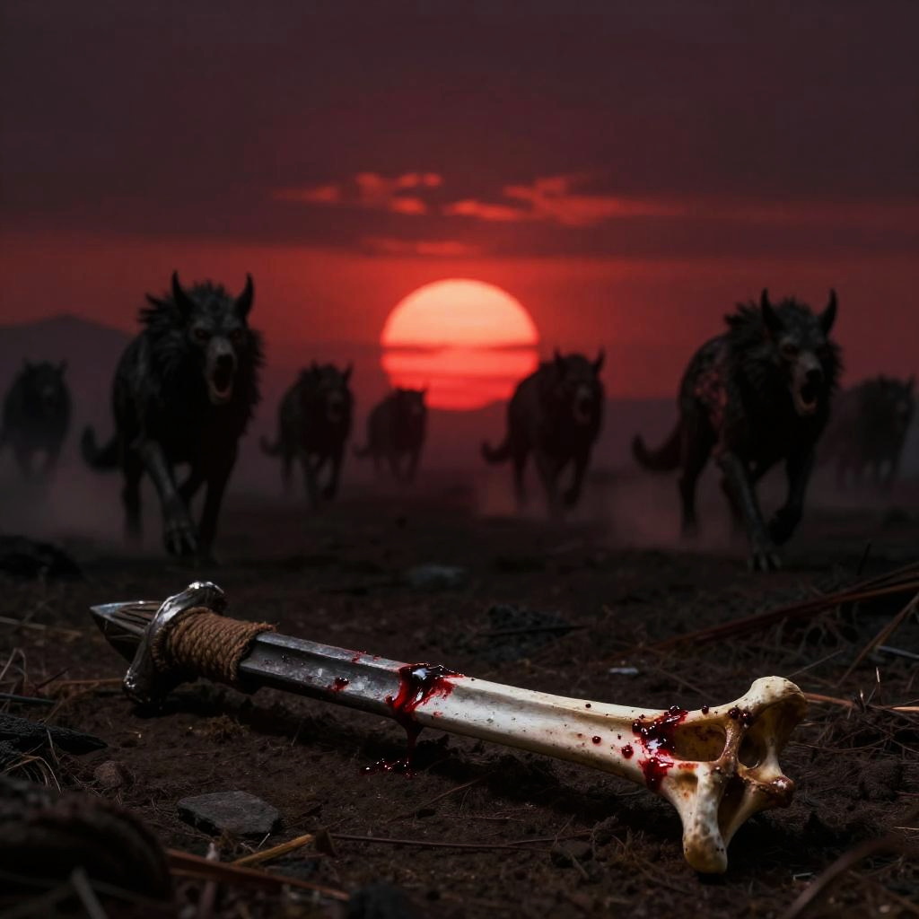 Gnoll blood smeared on bone weapons, desolate wasteland setting, howling gnoll pack silhouetted against a crimson sunset, dark fantasy art, moody and atmospheric