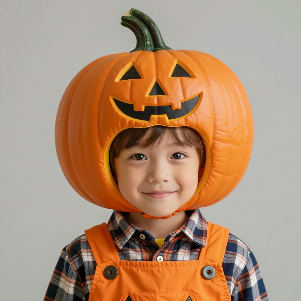 Child in Pumpkin Costume by Orange Tree