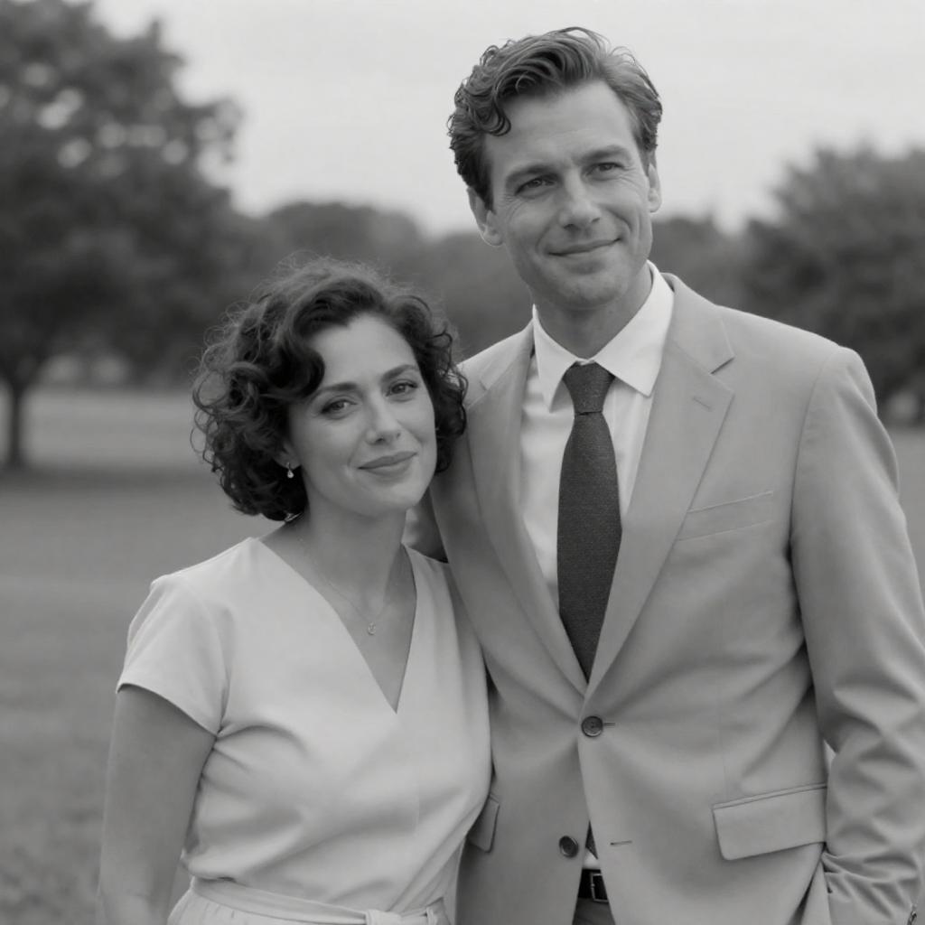 Black-and-white photograph of three people: a smiling woman with short curly hair in a white blouse and black jacket, a laughing woman with short hair in a light shirt, and a bearded man in a cowboy hat and dark jacket. They stand near a car, with a blurred outdoor background. The man wears a badge on his jacket.