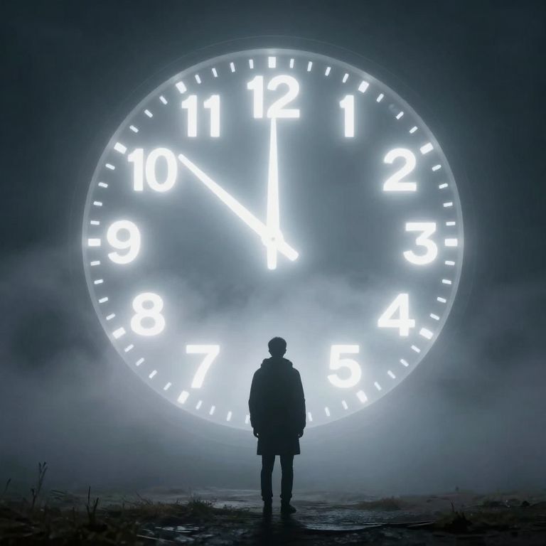 Foggy clock hands tick backward, encircling a solitary figure who stands before a luminous, circular timepiece, its digits glowing against swirling mist, evoking a surreal journey through reversed moments.