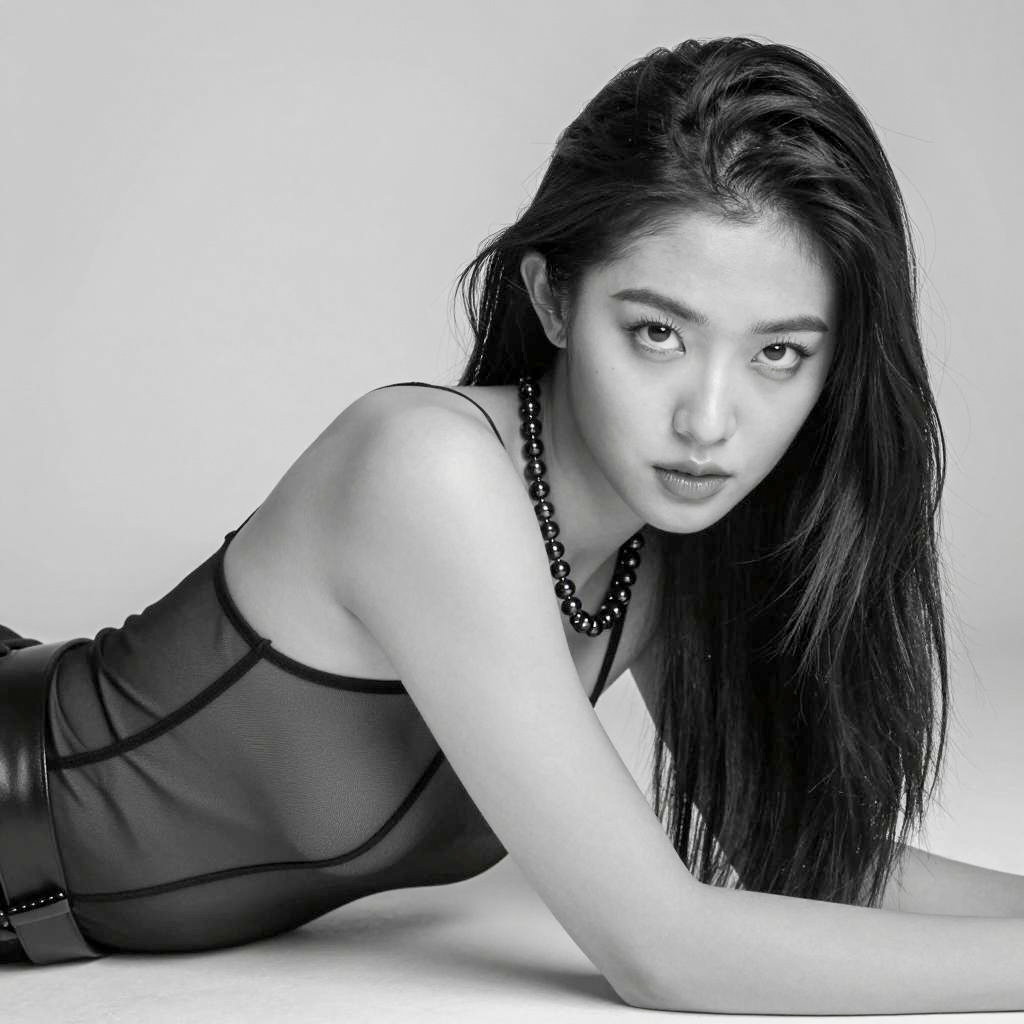 Black and white close-up portrait of an Asian woman with heavy eye makeup and tousled dark hair in the foreground. Behind her, three Asian men stand in shadow with neutral expressions; one wears a robe, another a dark suit, and the third is shirtless. The background features a rough textured wall.