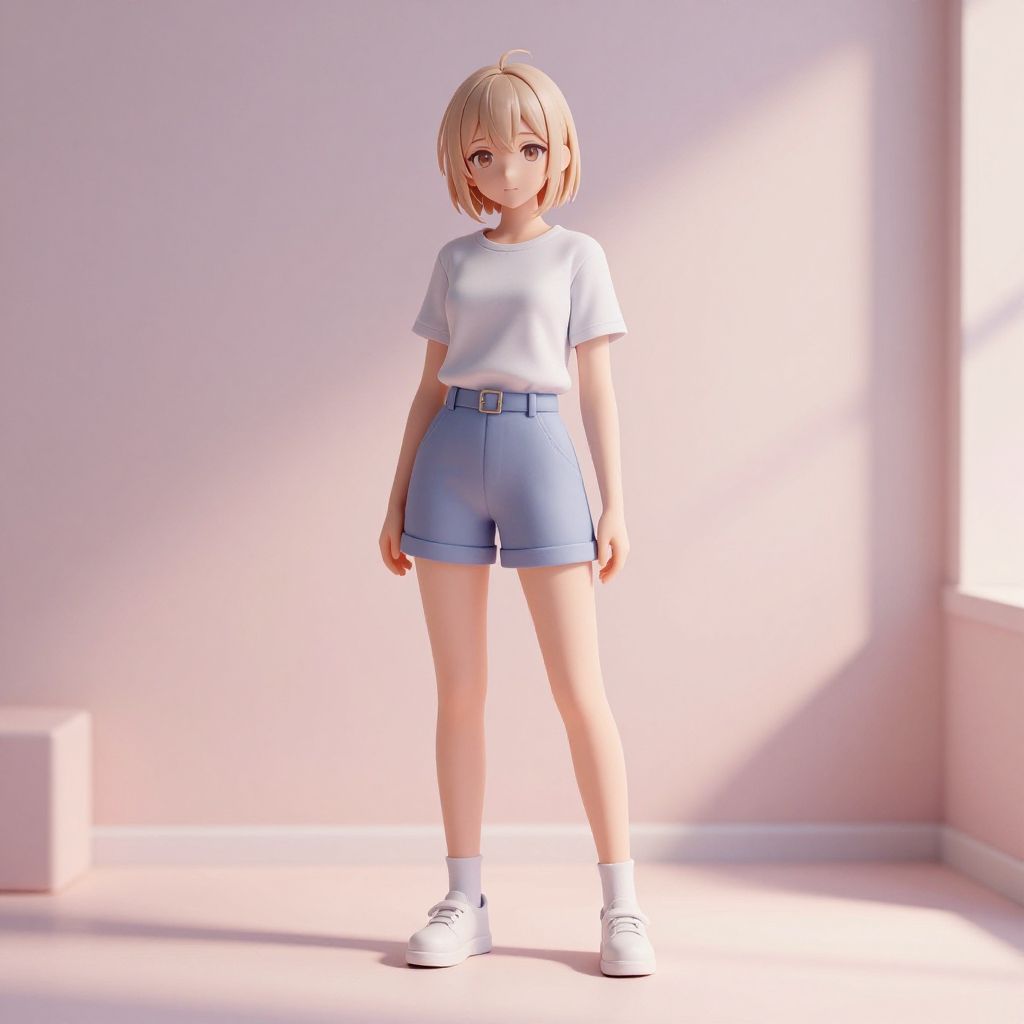 Vtube model in minimalist room with soft pastel lighting, anime-style character with modern outfit, subtle facial expressions, high contrast shadows, clean and polished finish