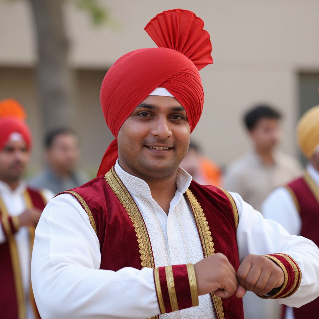 Costume bhangra dance, a close up of a man in a turban smiling for the camera