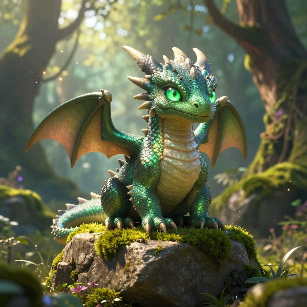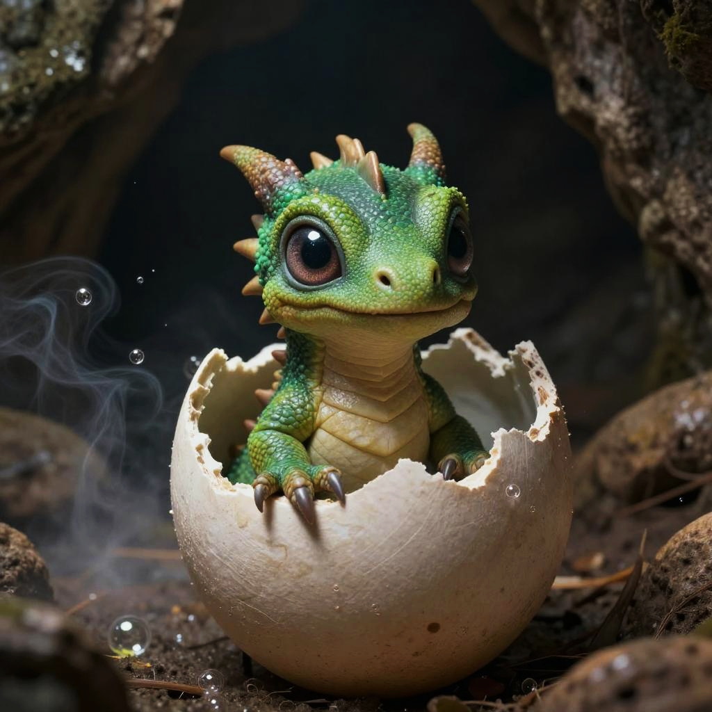 A highly detailed, digital CGI image depicts a small, green, dragon-like creature with large, expressive brown eyes and tiny horns, emerging from a broken, white egg shell. The creature's skin is textured with scales, and it has a yellow underbelly. It stands in a dark, rocky cave with moisture and small bubbles visible. The background is shadowy, with moss-covered rocks, creating a mystical, forest-like ambiance. The egg shell is cracked around the creature, revealing its tiny, clawed feet. The image has a fantasy, whimsical style.
