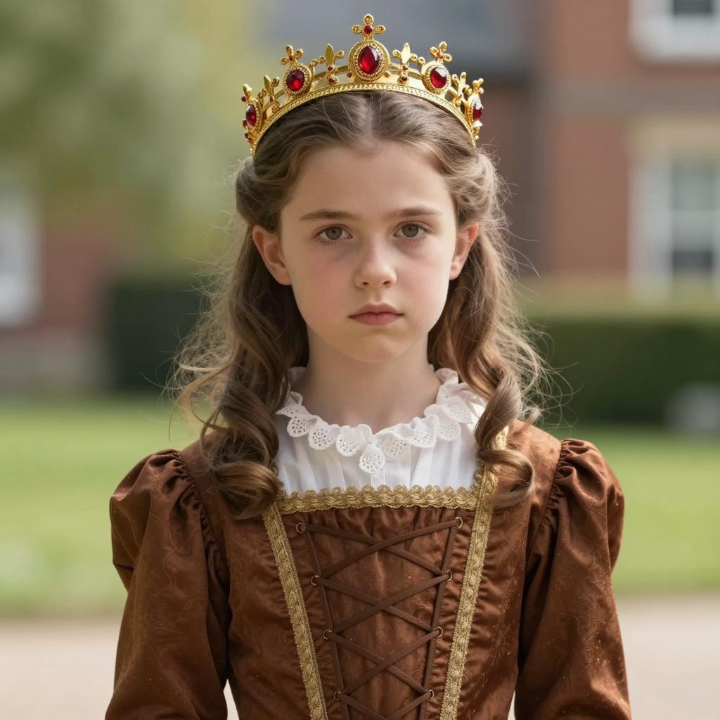 Queen elizabeth costume, photograph of a young girl, Renaissance-style dress, brown dress with white lace collar and corset-like lacing, gold crown with red jewels, fair skin, brown wavy hair, serious expression, daylight, soft sunlight, blurred background with greenery and brick buildings, realistic, detailed, slightly warm color palette, child centered, portrait, upper body, outdoor setting