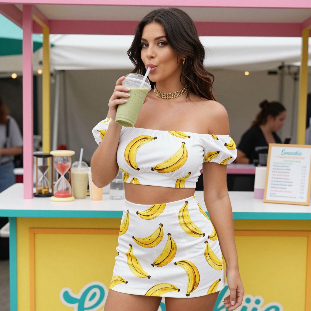 A hourglass woman in a playful summer style, wearing an off-the-shoulder cropped top with short puff sleeves and a matching high-waisted mini skirt featuring a banana print. She is adorned with a gold-tone choker necklace, enjoying a refreshing smoothie at a vibrant Smoothie Stand at a Farmers Market. The scene is captured in the visual style of Pedro Campos, emphasizing the lively atmosphere and bright colors around her. Sexy. Pretty face and beаutiful eyes. Big breasts